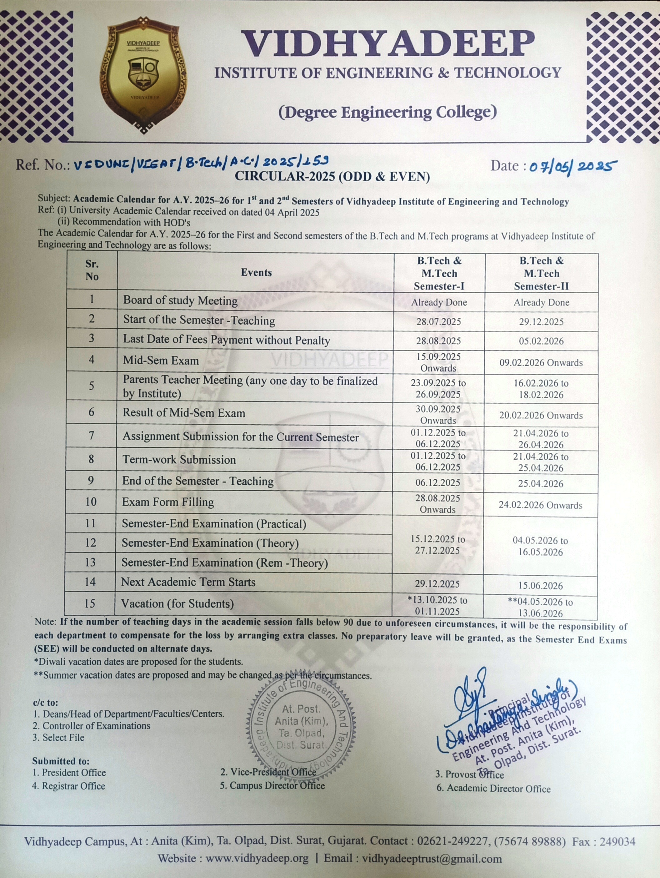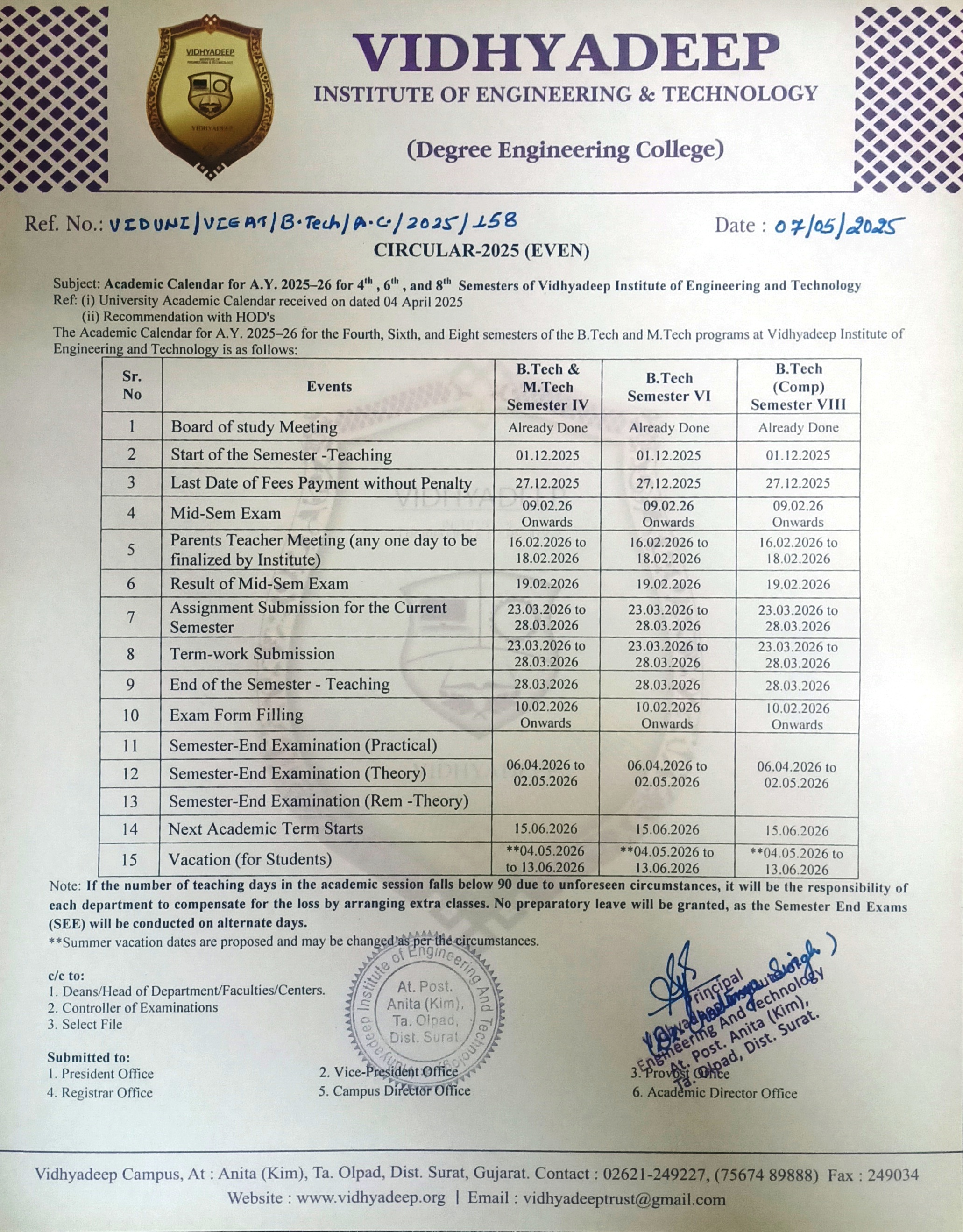 Vidhyadeep Institute of Engineering & Technology is committed to academic excellence, integrating the principles of NEP 2020 through multidisciplinary learning, skill development, research orientation, and holistic education. With a strong emphasis on sustainability, ethics, innovation and industry collaboration, we nurture responsible, future-ready graduates capable of contributing meaningfully to society and the global knowledge economy.
